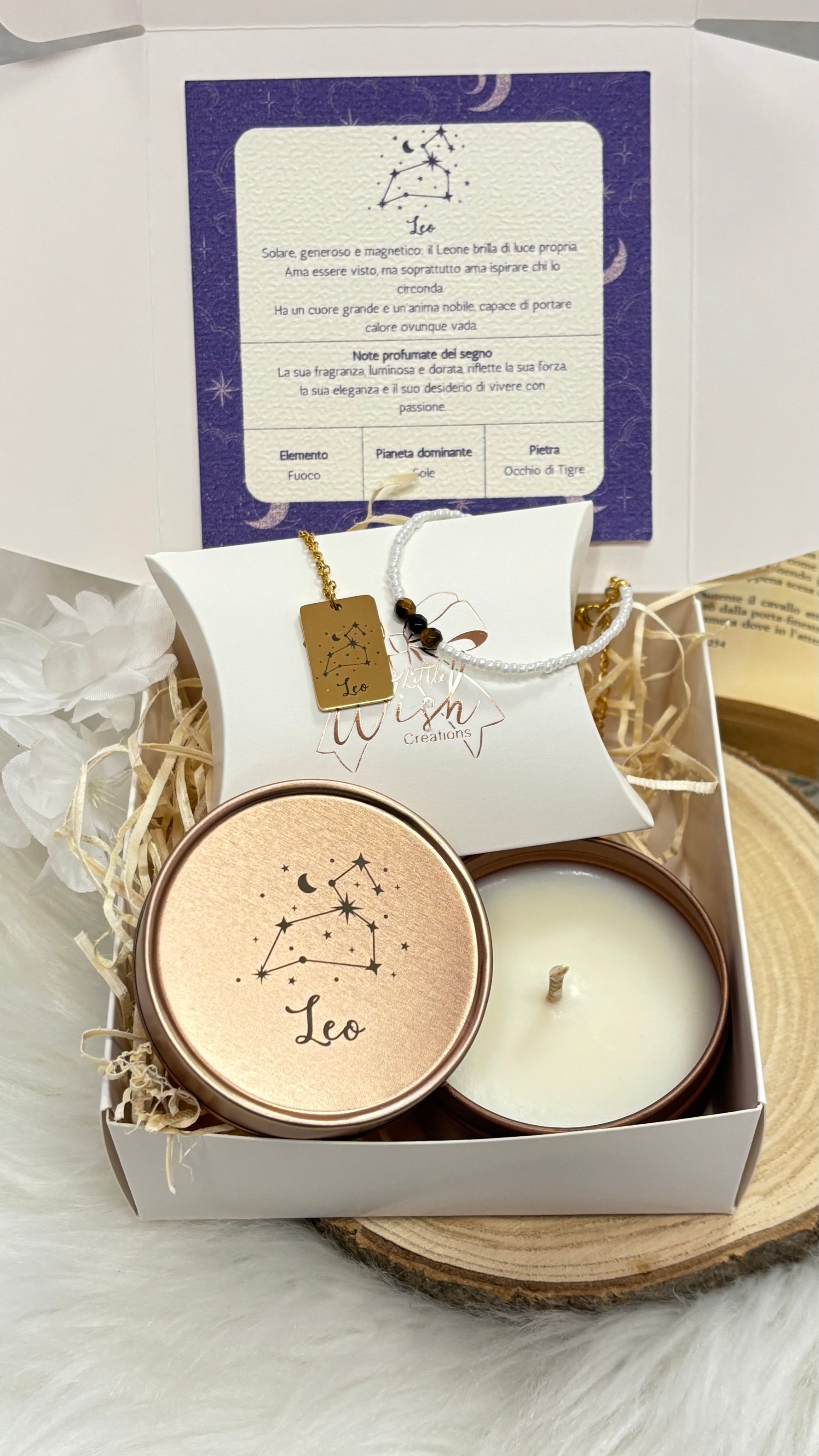 Candela profumata e colata a mano con fragranze certificate; collana in acciaio inox; bracciale artigianale con pietre naturali e perline in vetro; card stampata su carta opaca di alta qualità.
