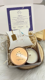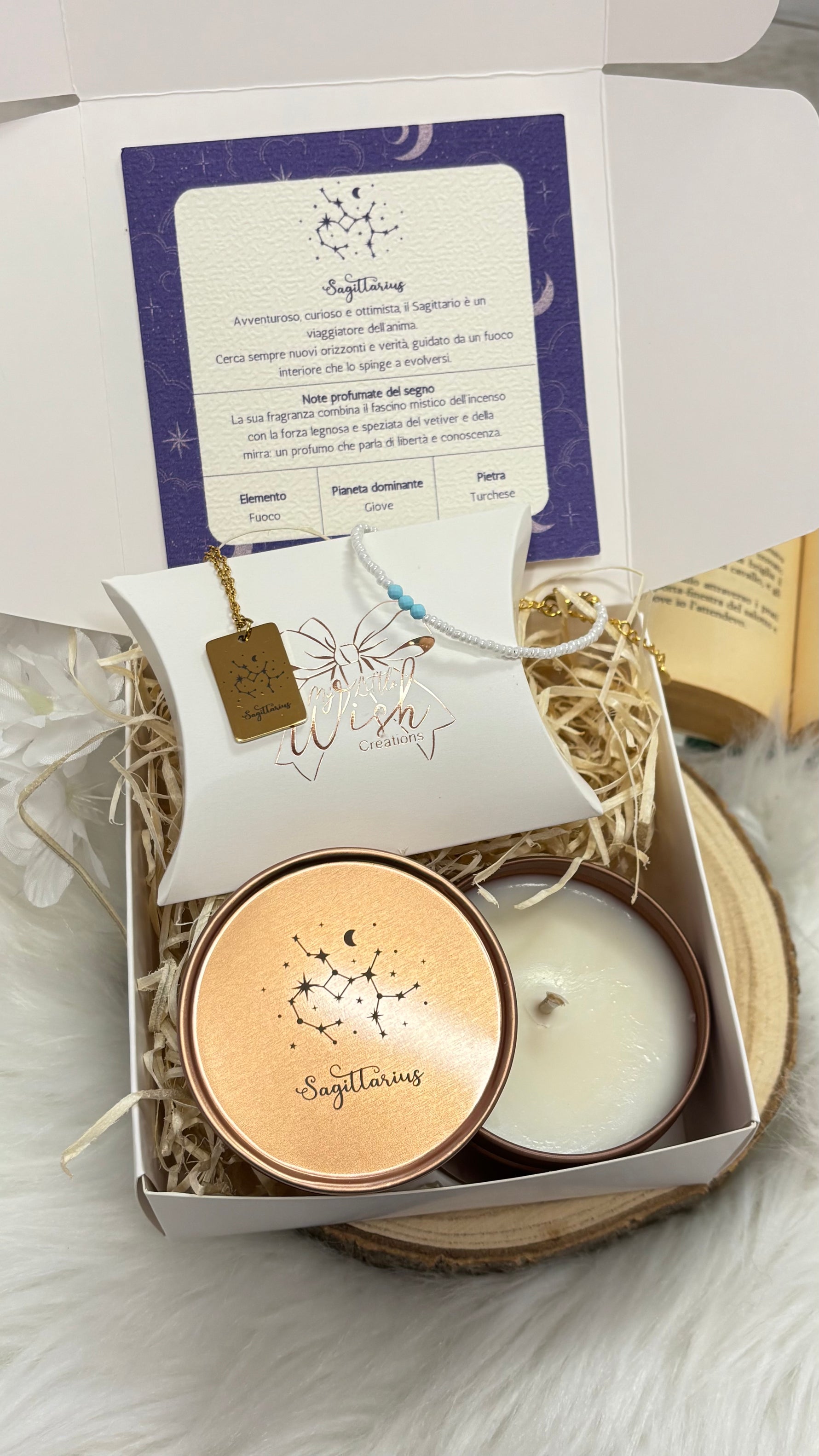 Candela colata e profumata a mano con fragranze certificate; collana in acciaio inox; bracciale artigianale con perline in vetro e pietre naturali; card stampata su carta opaca di alta qualità.