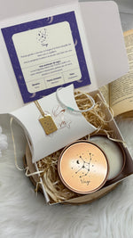 Candela profumata e colata a mano con fragranze certificate; collana in acciaio inox; bracciale realizzato a mano con perline in vetro e pietre naturali; card stampata su carta opaca di alta qualità.