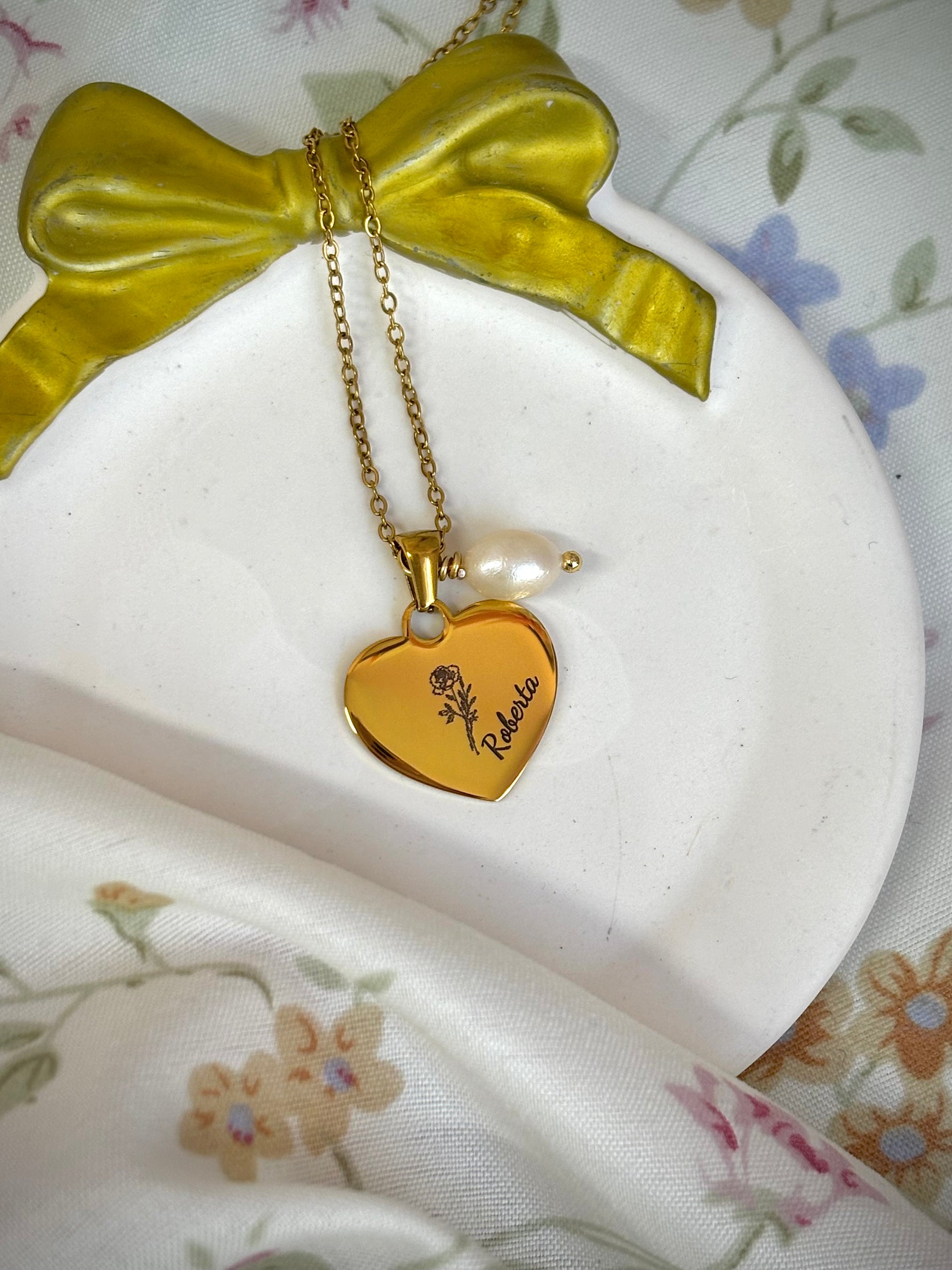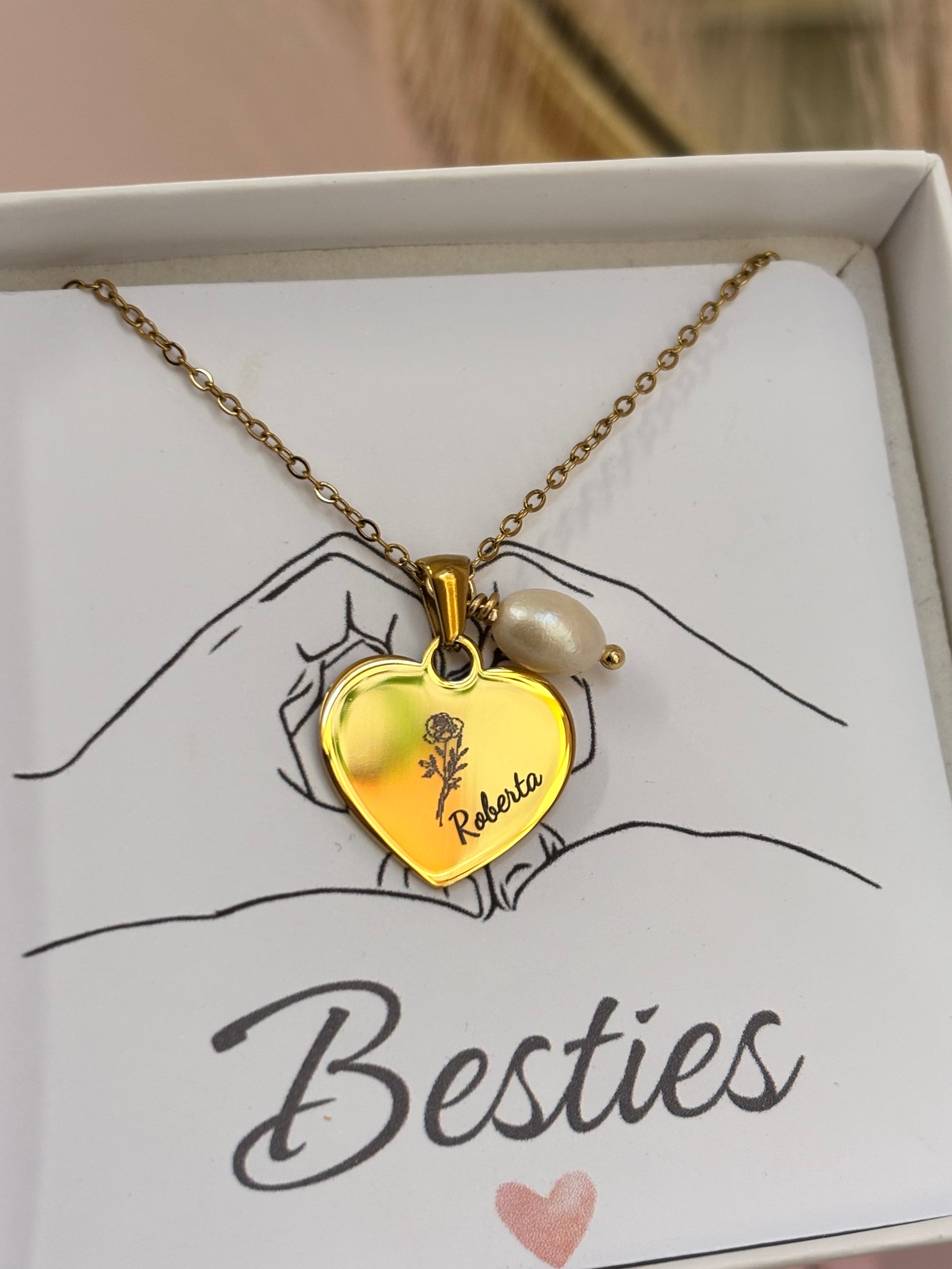 Questa collana ha un grazioso ciondolo a forma di cuore che potrai personalizzare con un fiore a scelta (vedi foto) e il nome delle tua migliore amica.