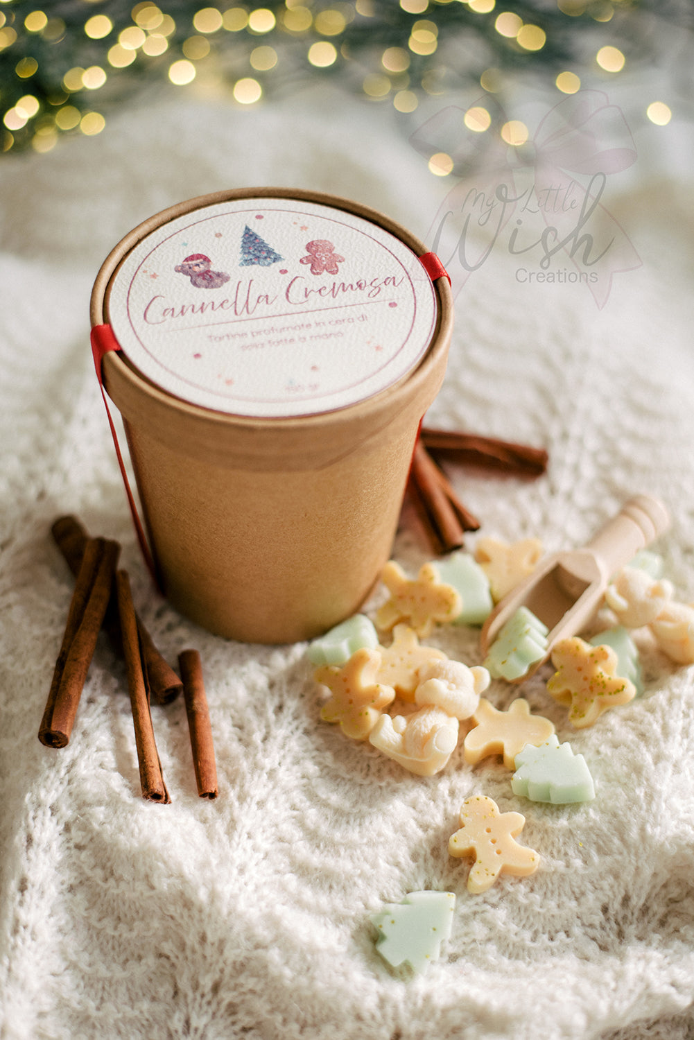 Un mix irresistibile di tartine profumate in cera di soia, realizzate a mano e racchiuse in un elegante contenitore kraft con paletta in legno.