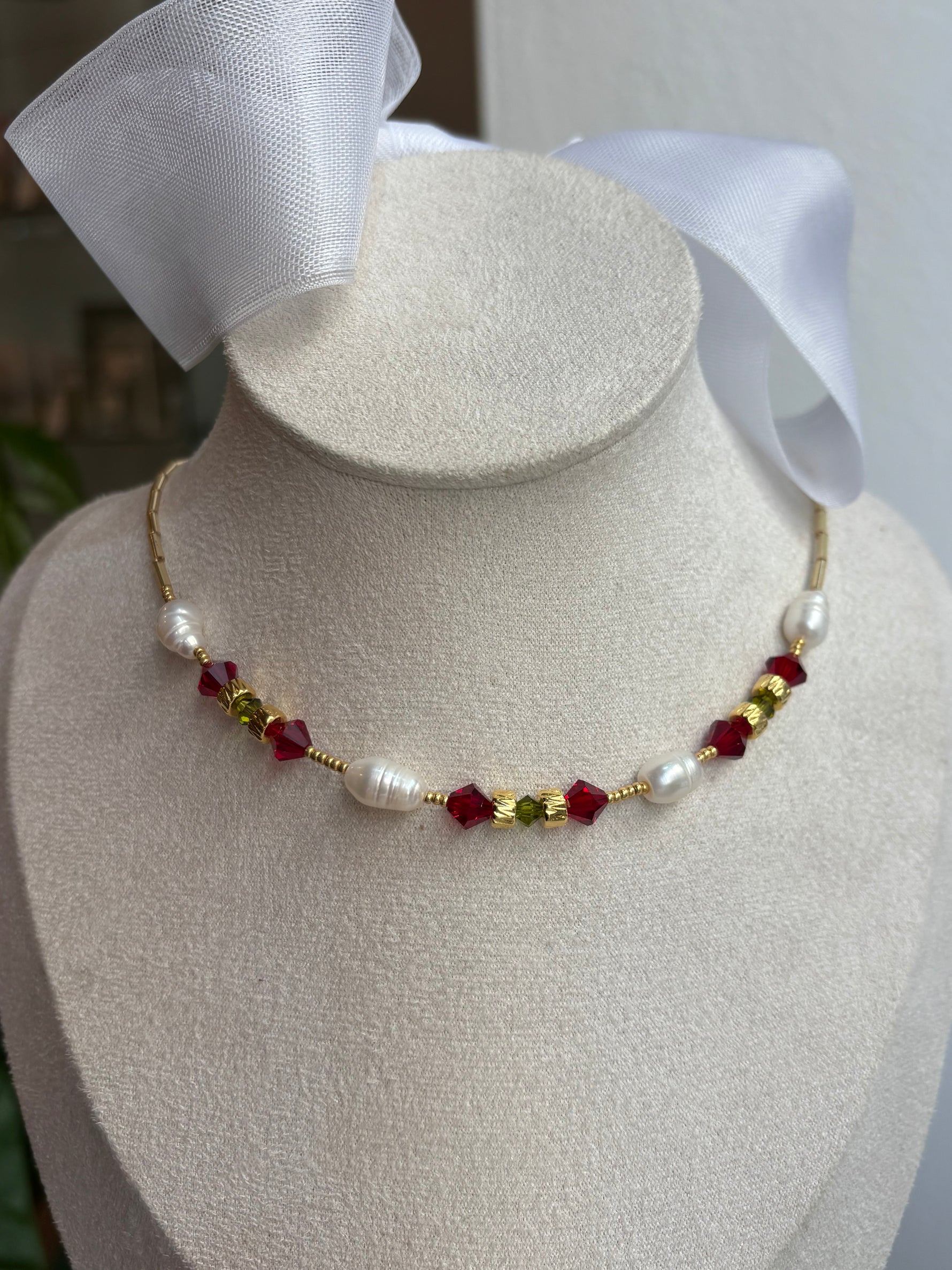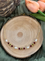 Un girocollo che celebra lo spirito libero e bohémien, dove la raffinatezza delle perline Miyuki oro incontra la bellezza naturale delle perle d'acqua dolce.