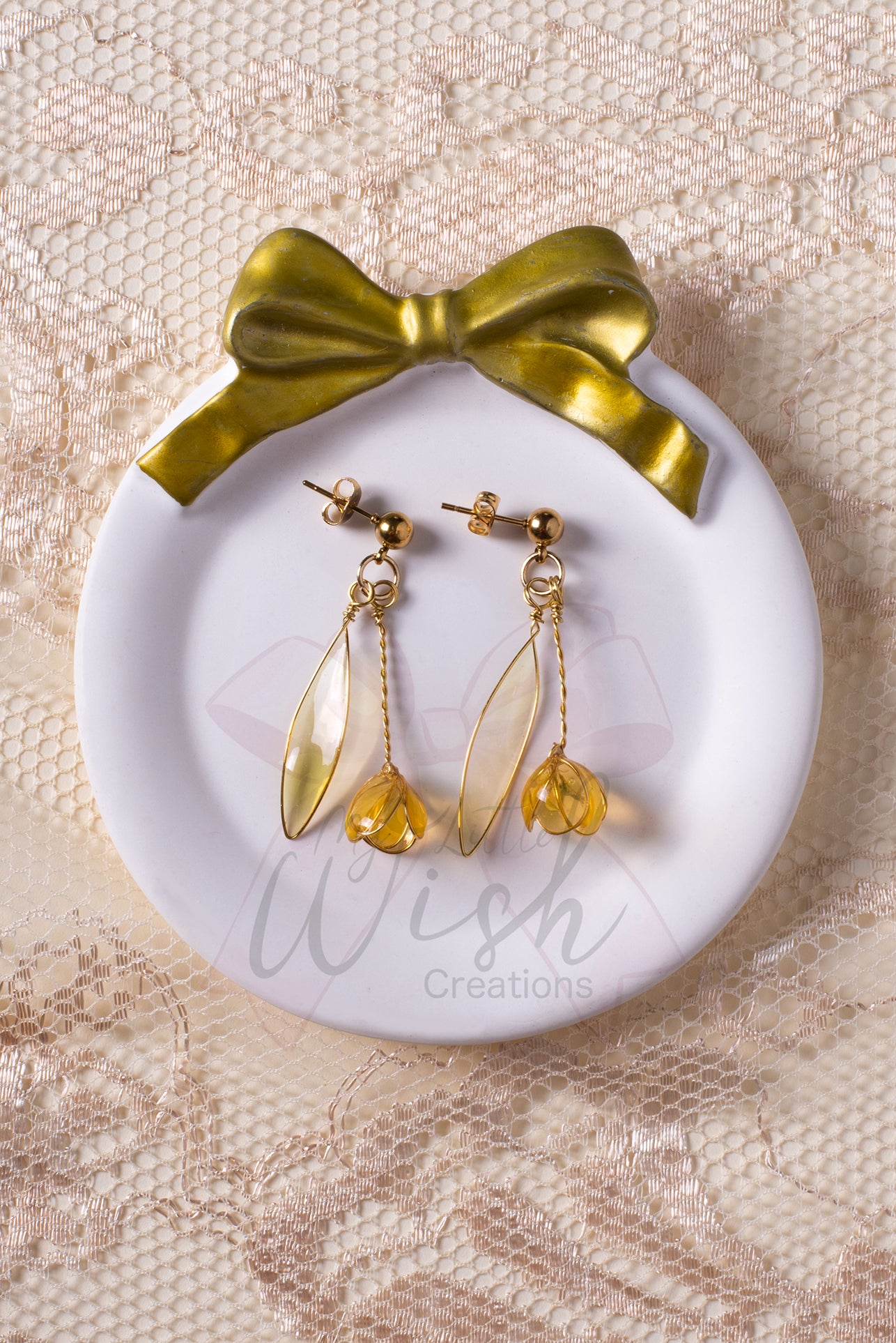 Ispirati alla vivace fioritura dei tulipani nella Prefettura di Toyama, questi orecchini pendenti catturano l’essenza della gioia e della rinascita. Realizzati a mano, ogni fiore in resina è modellato con filo dorato, creando un gioco di luci e riflessi che danza con ogni movimento.