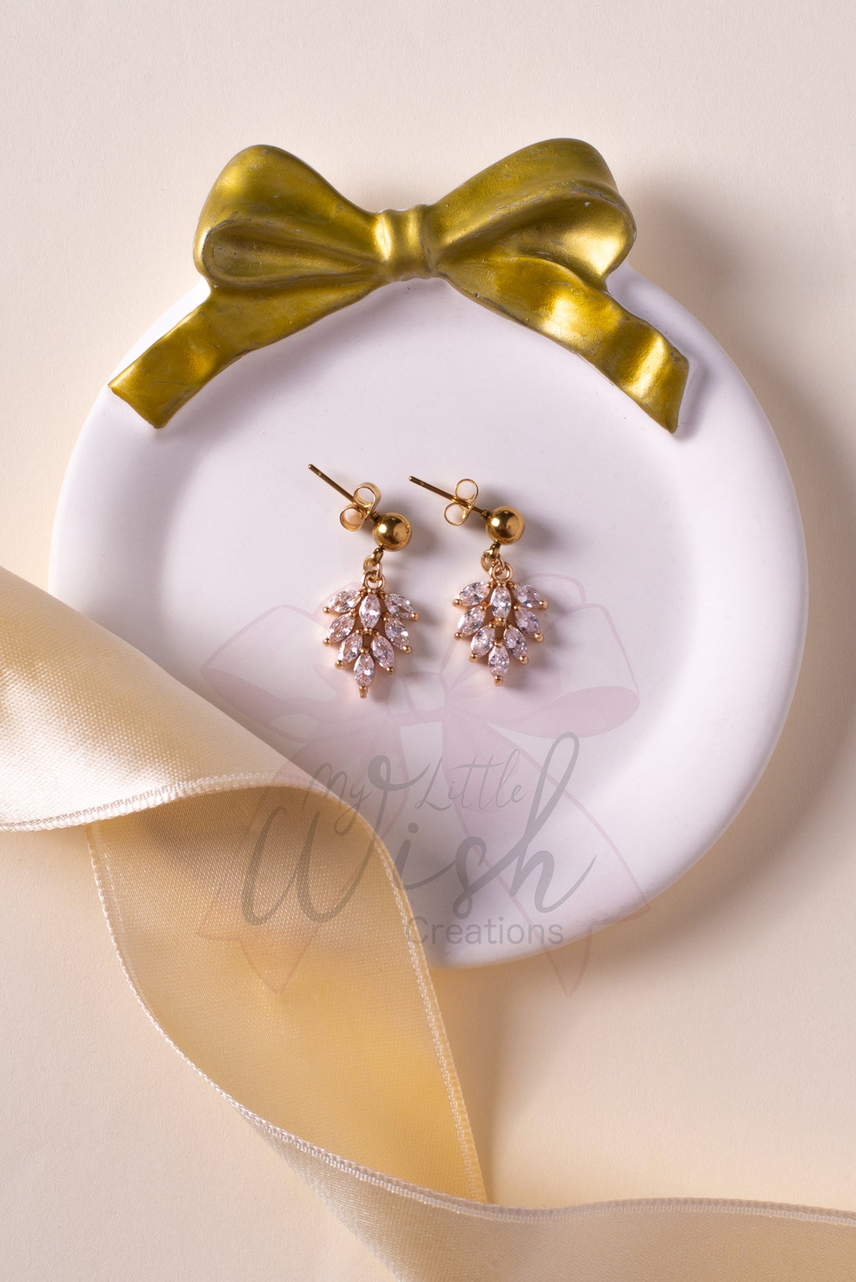 Elegante Ohrringe mit vergoldeter Messingbasis mit kleinen rosa Zirkonia und Anhänger mit weißen Zirkonia.