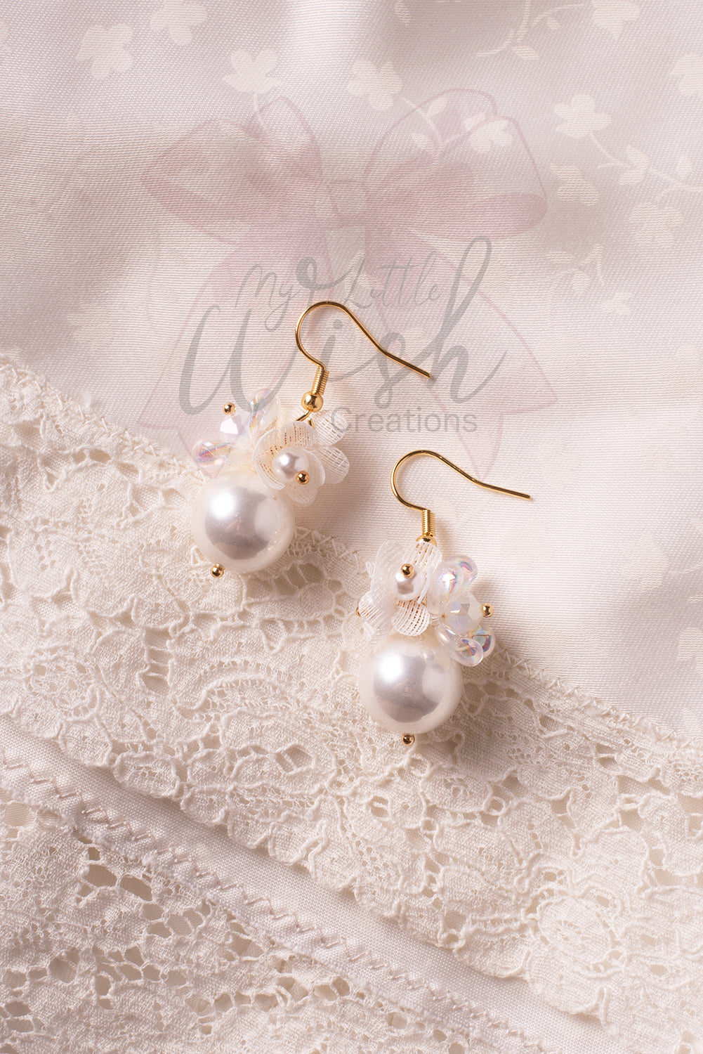 Romantisches und elegantes Paar Ohrringe mit Maxi-Acrylperle und kleinen Blumen in Weißtönen.